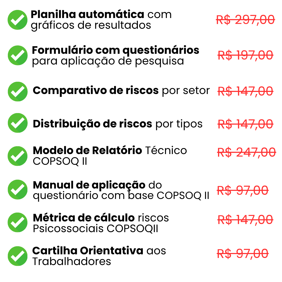Tenha em mãos um relatório pronto, validado e profissional para aplicar o COPSOQ com segurança e mostrar domínio total na análise de riscos psicossociais